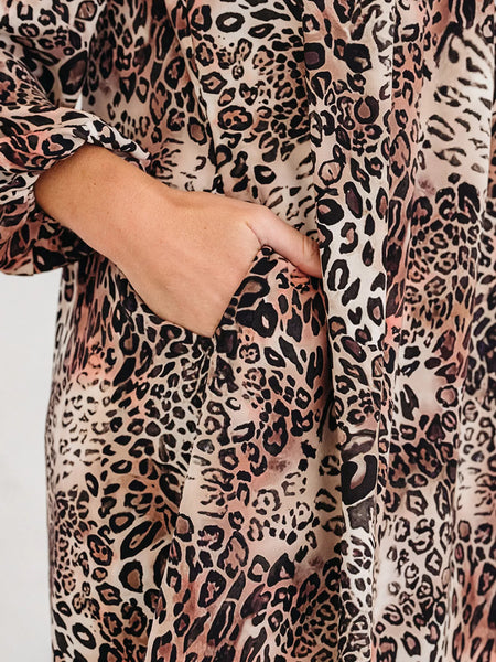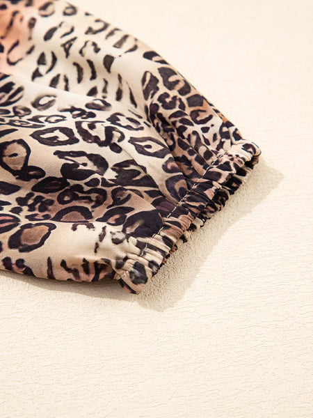 Leopard Ruffled Detail Long Sleeve Loose Mini Dress